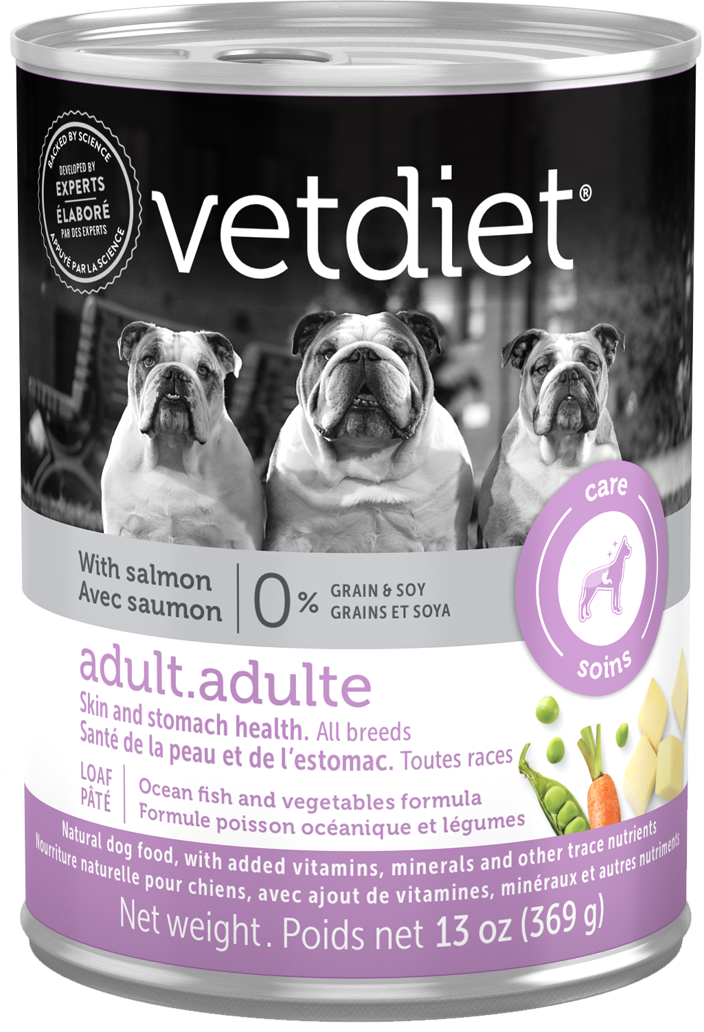 Vetdiet® adult skin and stomach health dog food is specially formulated with a limited source of proteins from fish for your dog’s unique needs. Our grain-free wet food provides: