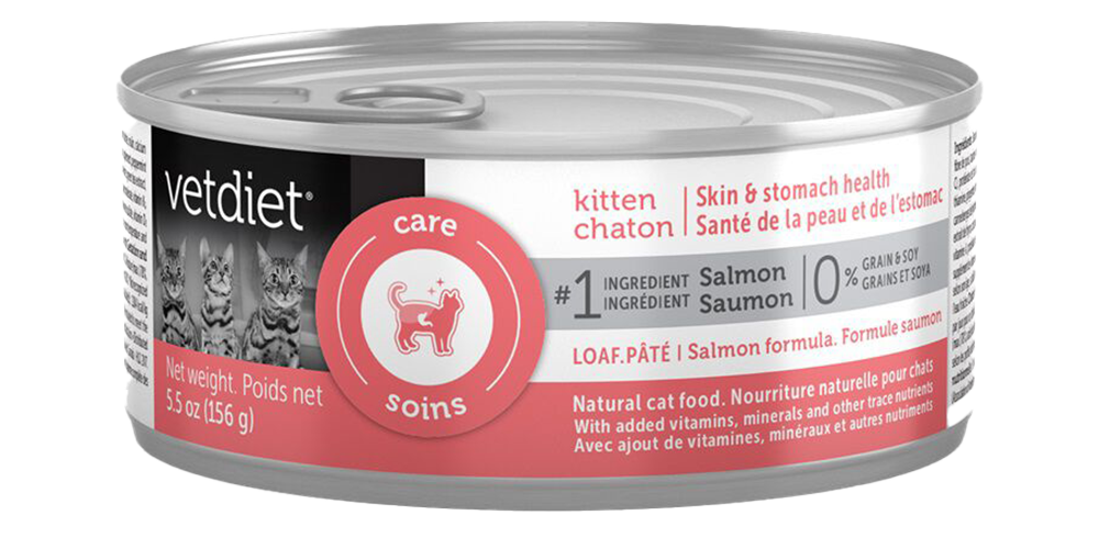 La nourriture humide pour chatons Vetdiet, santé de la peau et de l’estomac est spécialement formulée avec des ingrédients de haute qualité. Parmis ceux-ci se trouve; une source limitée de protéines provenant du saumon et des ingrédients naturels. Ce repas, sans grain, est formulé pour répondre aux besoins spécifiques de certains chatons.