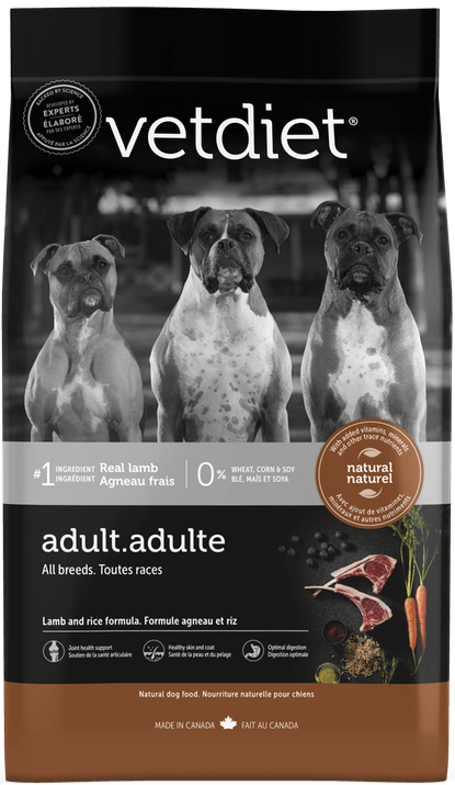 La nourriture pour chien adulte toutes races – formule agneau et riz Vetdiet® est spécialement formulée avec de l’agneau frais, des grains entiers et plusieurs autres ingrédients naturels, afin de répondre aux besoins nutritionnels spécifiques de votre chien. Cette formule offre :
